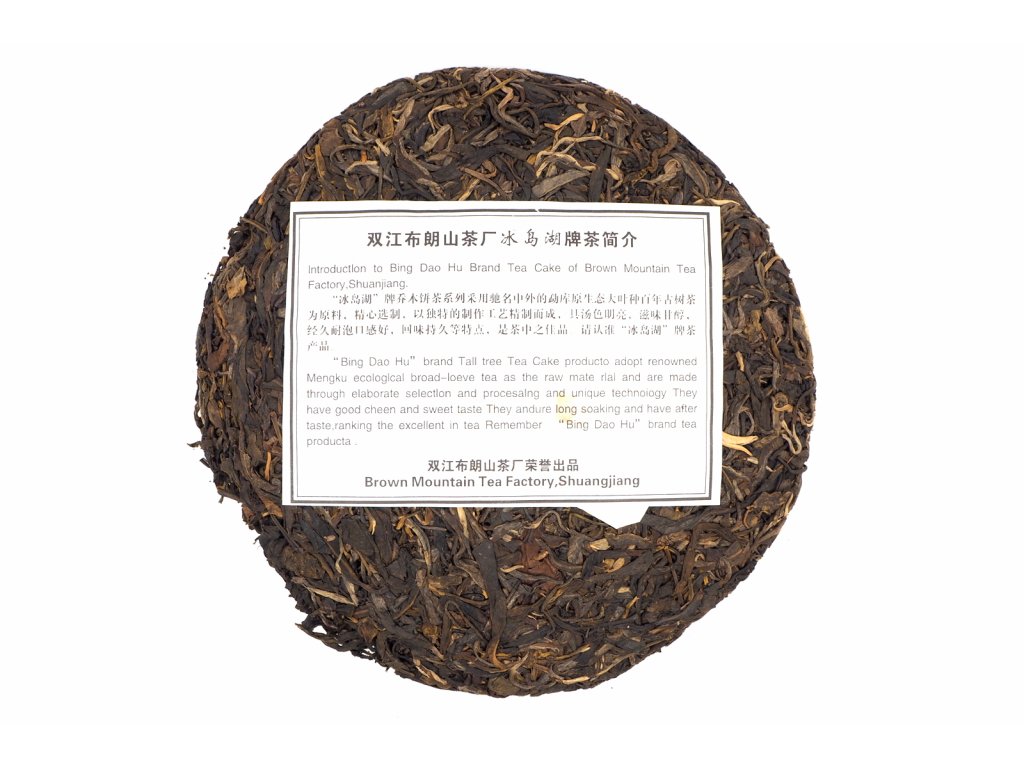 Na výrobu tohoto již krásně prozrálého puerhu byla použita směs lístků z polodivokých čajovníků rostoucích v oblasti Shuang Jiang, konkrétně z okolí starobylé vysokohorské vesnice Bing Dao ("Ledový ostrov") v okrese Meng Ku. Pěstování a výrobě Puerhu se ve zdejší oblasti věnují více než 500 let. Vesnice je proslavená výskytem letitých čajovníků. Jedná se o kvalitní, dobře rolovaný, středně dlouhý, tmavě zelený list s podílem tipsů. Po zalití nám dává čaj zelenožlutý nálev středně silné, charakteristicky trávové, lehce květové, mírně nasládlé chuti. Cena je za jeden koláček vážící 357 g.