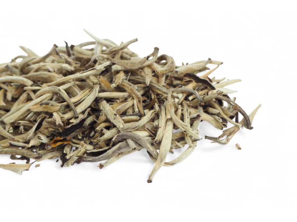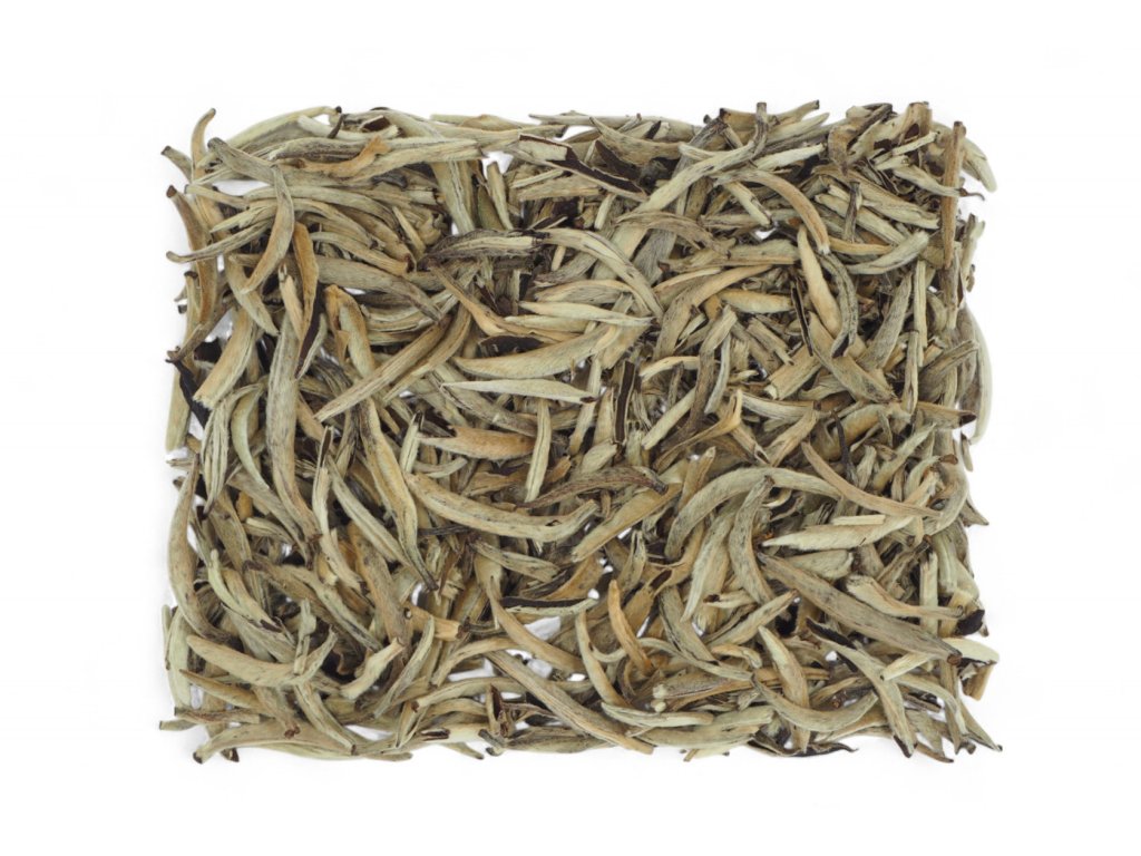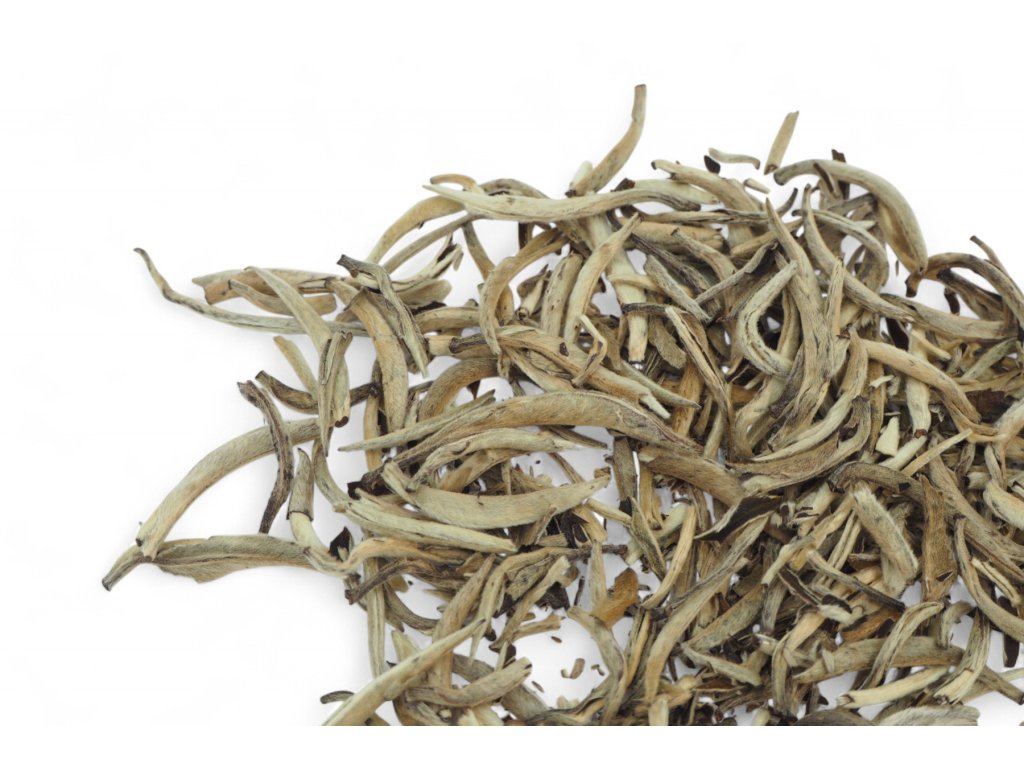 Stříbrné jehličky vyrobené výhradně z vrcholových lístků čajovníku, sklizené v provincii Fujian. Sběr se provádí jen během velmi krátkého období na jaře, a jen za pěkného počasí. Čerstvá, svěží chuť a lístky tančící u hladiny průzračného nálevu jsou okouzlující. Nálev má barvu mandlově žlutou až pomerančovou. Chuť je bylinná, ovocně nasládlá s tóny přezrálých hrušek, zcela bez trpkosti, s lehkou vůní tropického ovoce. Cena za 50 g.