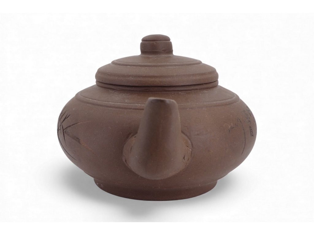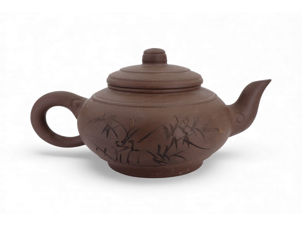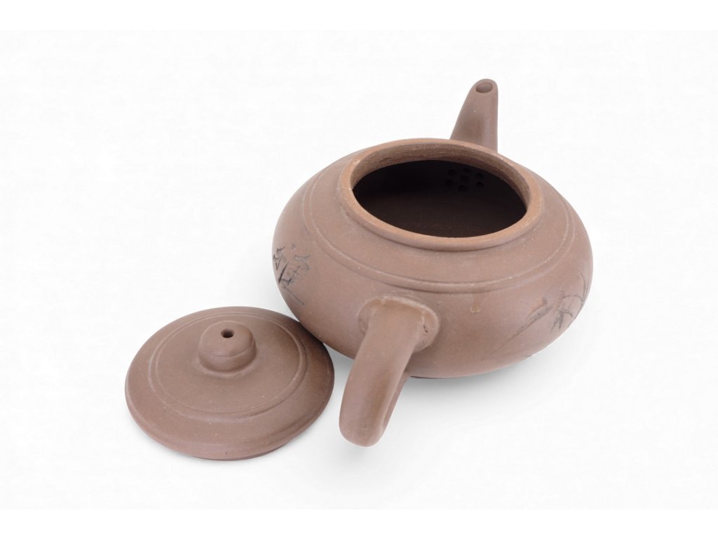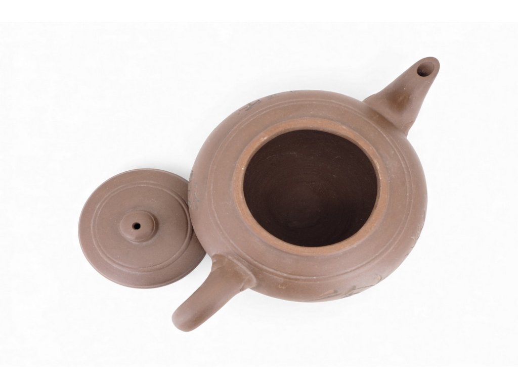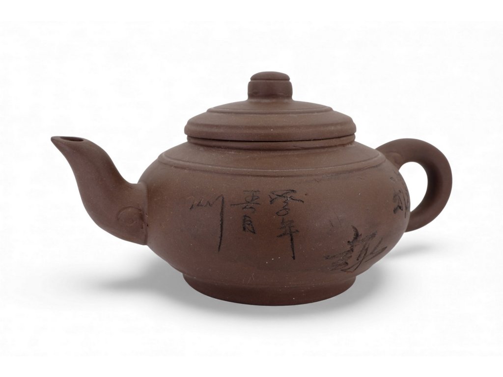 Základní hnědá keramická konvička zdobená znaky. Objem 400 ml.