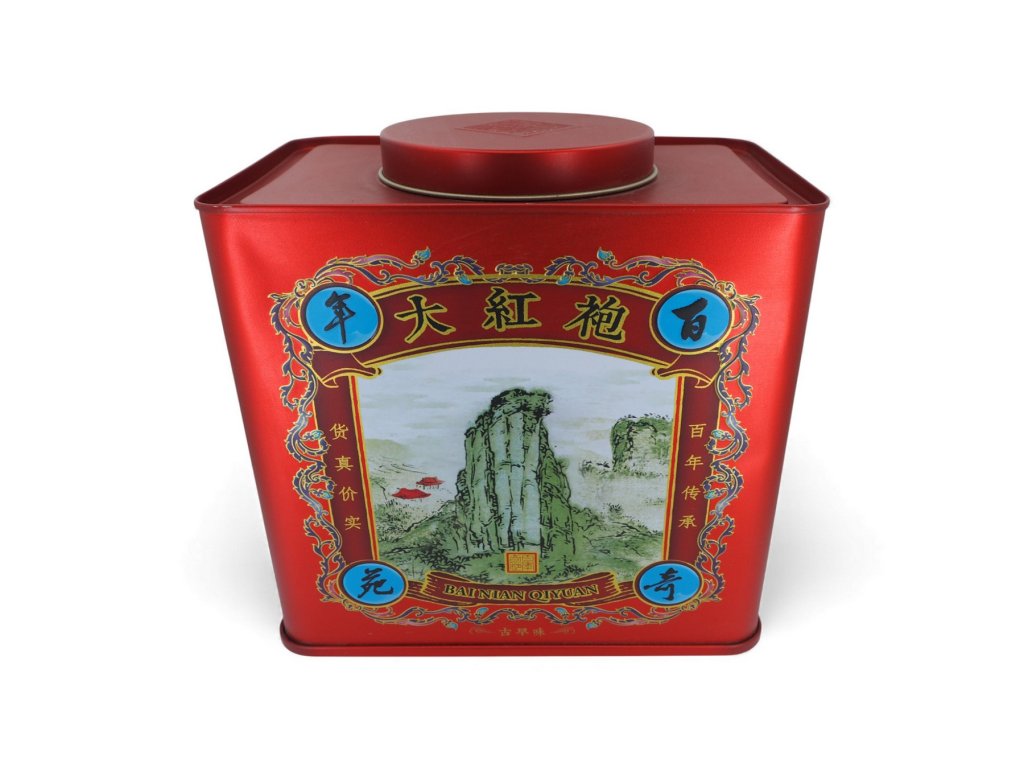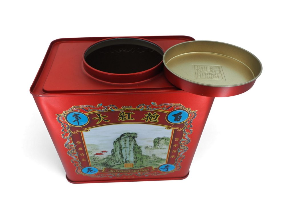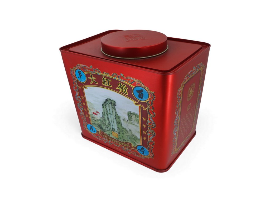 Větší plechová dóza, do které byl zabaleny čínské útesové oolongy z Wu Yi. Rozměry jsou 17,5 x 19 x 12,5 cm.