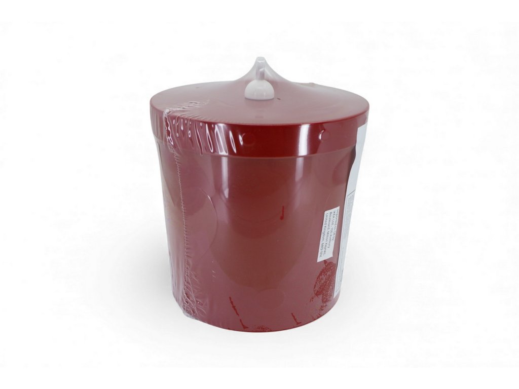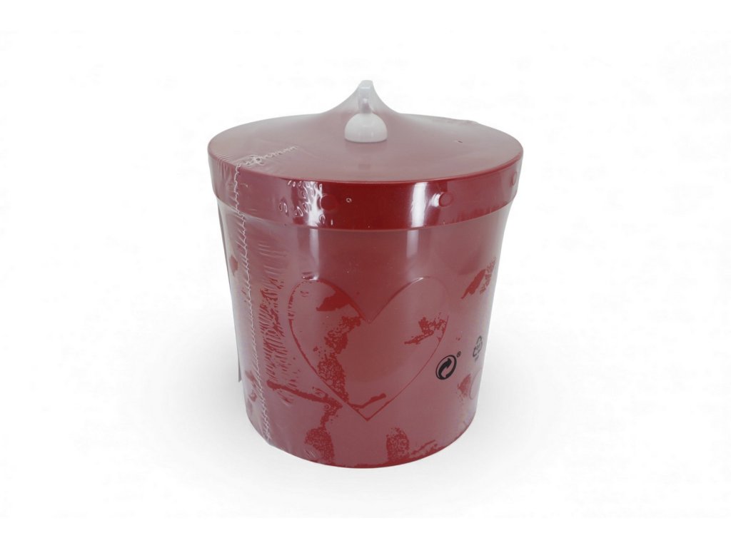 Plechová dóza tvaru válce, v červené barvě se srdíčkem, nerozbalená. Rozměry jsou 10 x 12 cm.