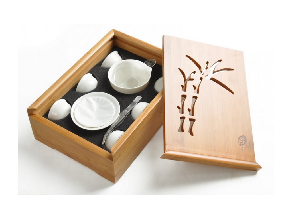 Praktická cestovní sada skládající se z čajového moře, gaiwanu, slévátka, šesti mističek, kovových kleštiček a sítka. Objem gaiwanu (zhongu) je přibližně 120 ml a objem jednotlivých mističek je 25 ml. Rozměry čajového moře jsou: 24 x 17 x 8 cm (d x š x v).