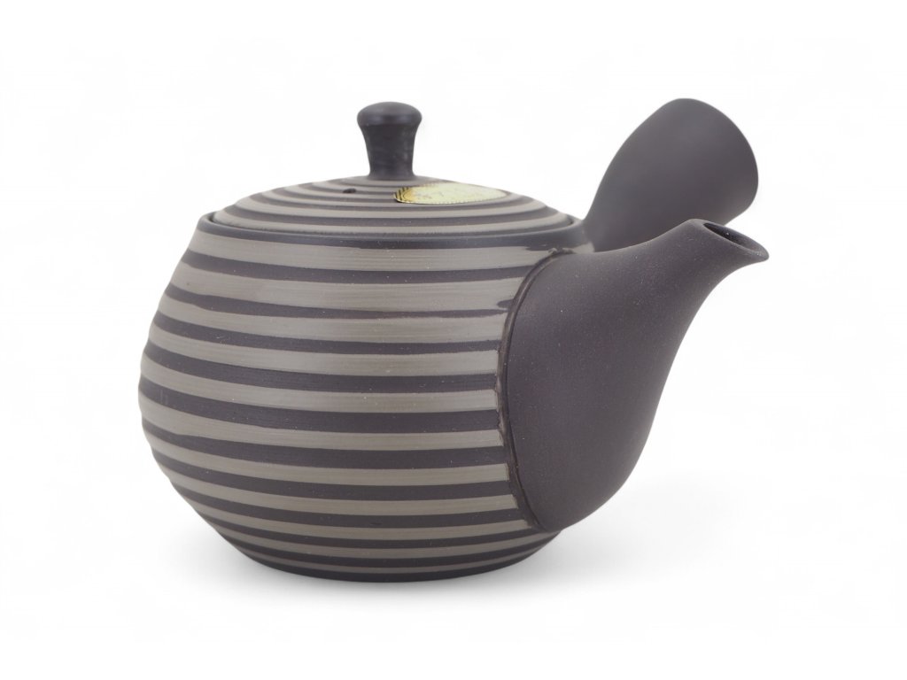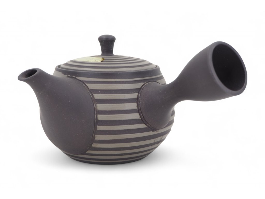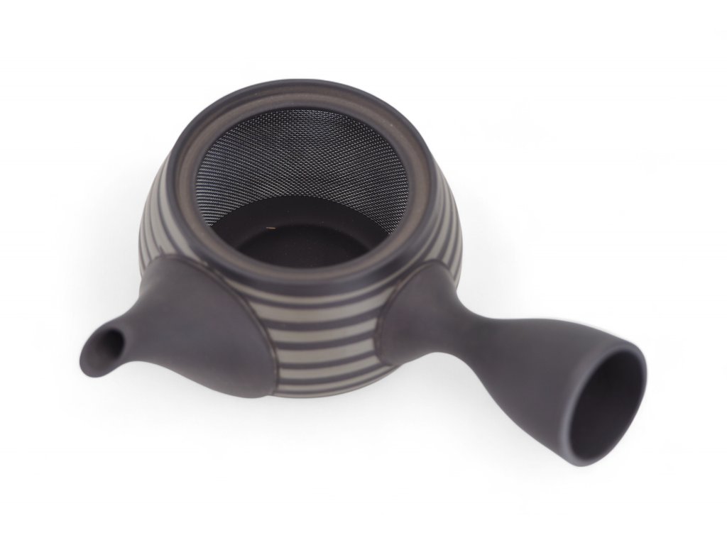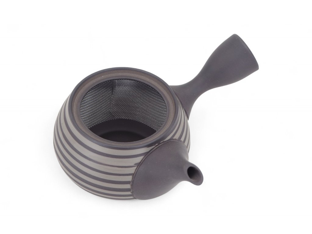 Keramická japonská konvička s bočním úchopem a pruhovaným designem. Konvička pochází z městečka Tokoname v Japonsku. Přímý dovoz. Pouze jediný kus skladem. Uvnitř je opatřena nerezovým sítkem po celém obvodu konvičky a je vhodná k popíjení fukamushi čaje. Objem konvičky je 200 ml.