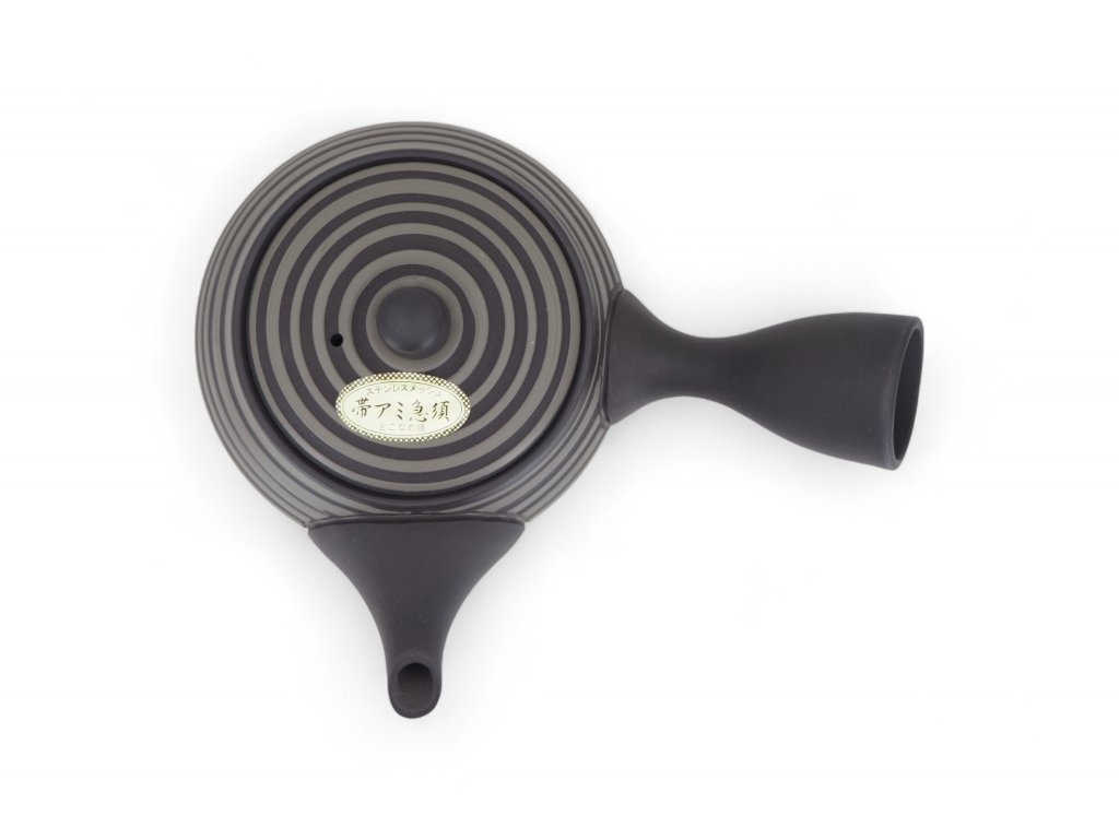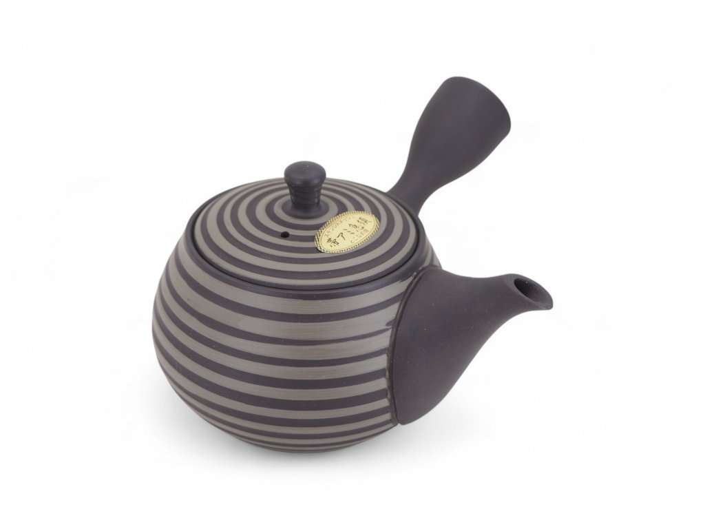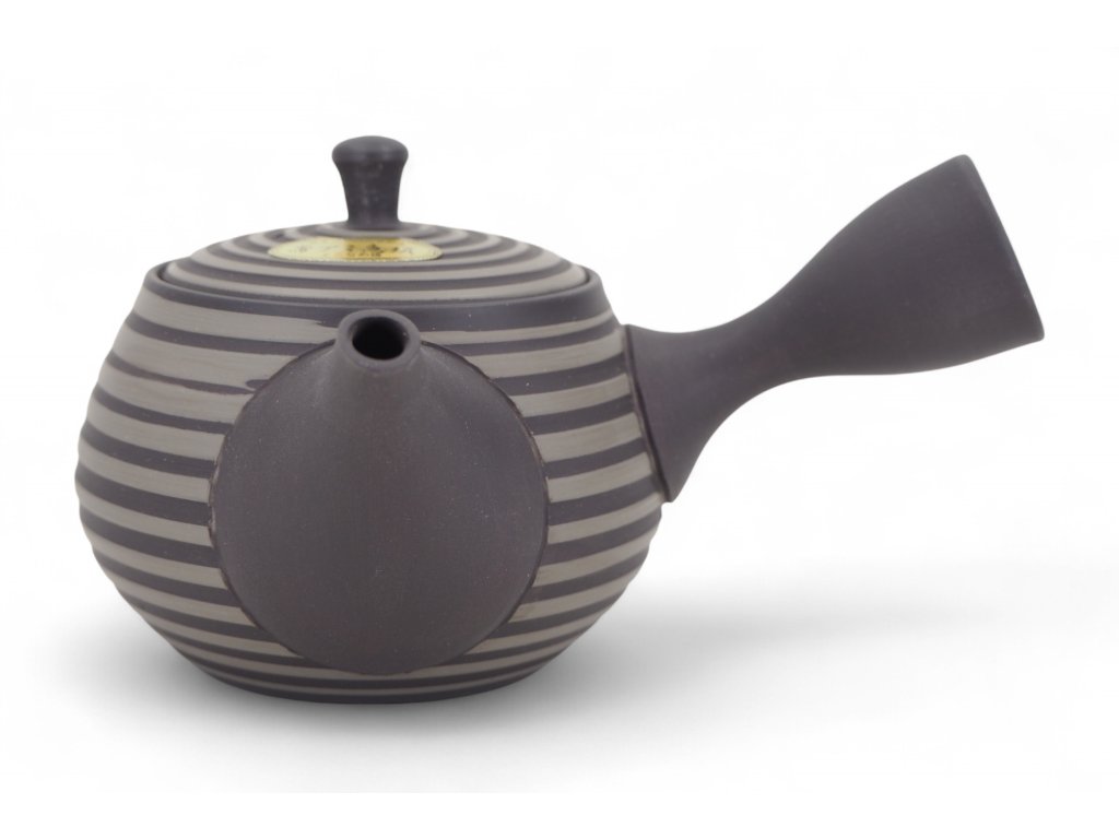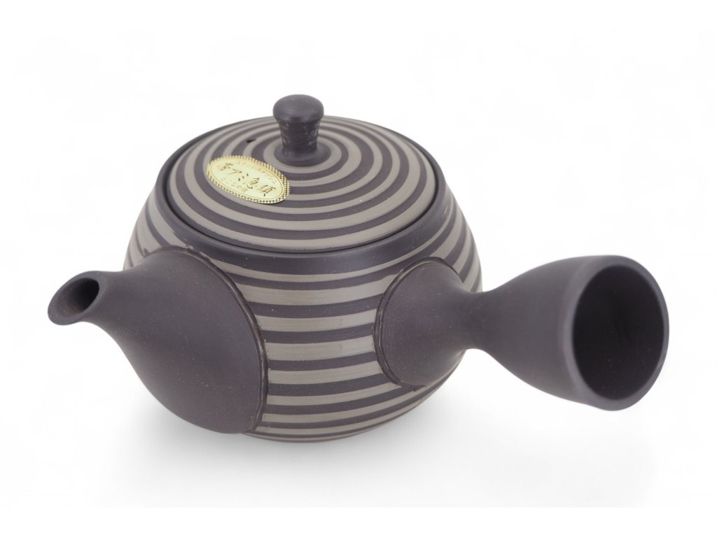 Keramická japonská konvička s bočním úchopem a pruhovaným designem. Konvička pochází z městečka Tokoname v Japonsku. Přímý dovoz. Pouze jediný kus skladem. Uvnitř je opatřena nerezovým sítkem po celém obvodu konvičky a je vhodná k popíjení fukamushi čaje. Objem konvičky je 200 ml.