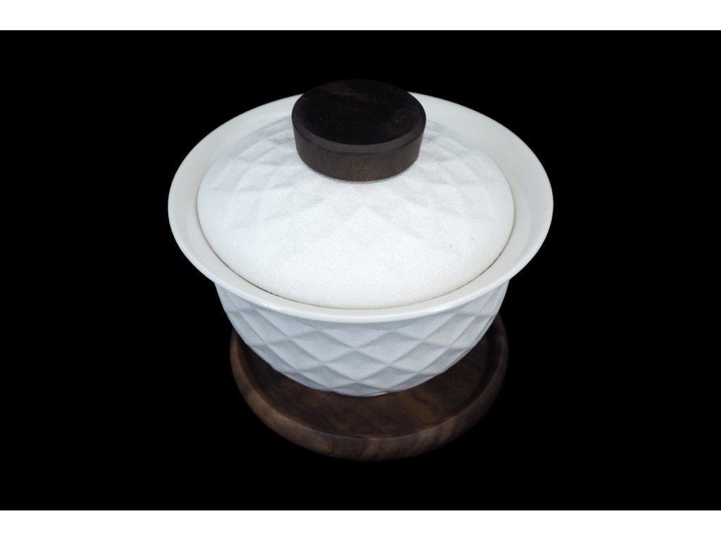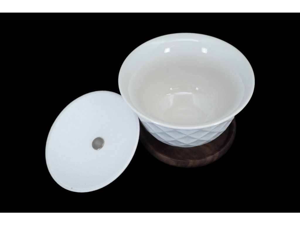 Porcelánový gaiwan "Menja" bílý s dřevěným držátkem a podtáckem. Objem gaiwanu je 100 ml.